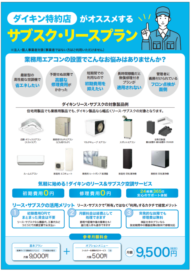 初期費用を抑えながら安心して空調設備を使えるのが大きな特長です。